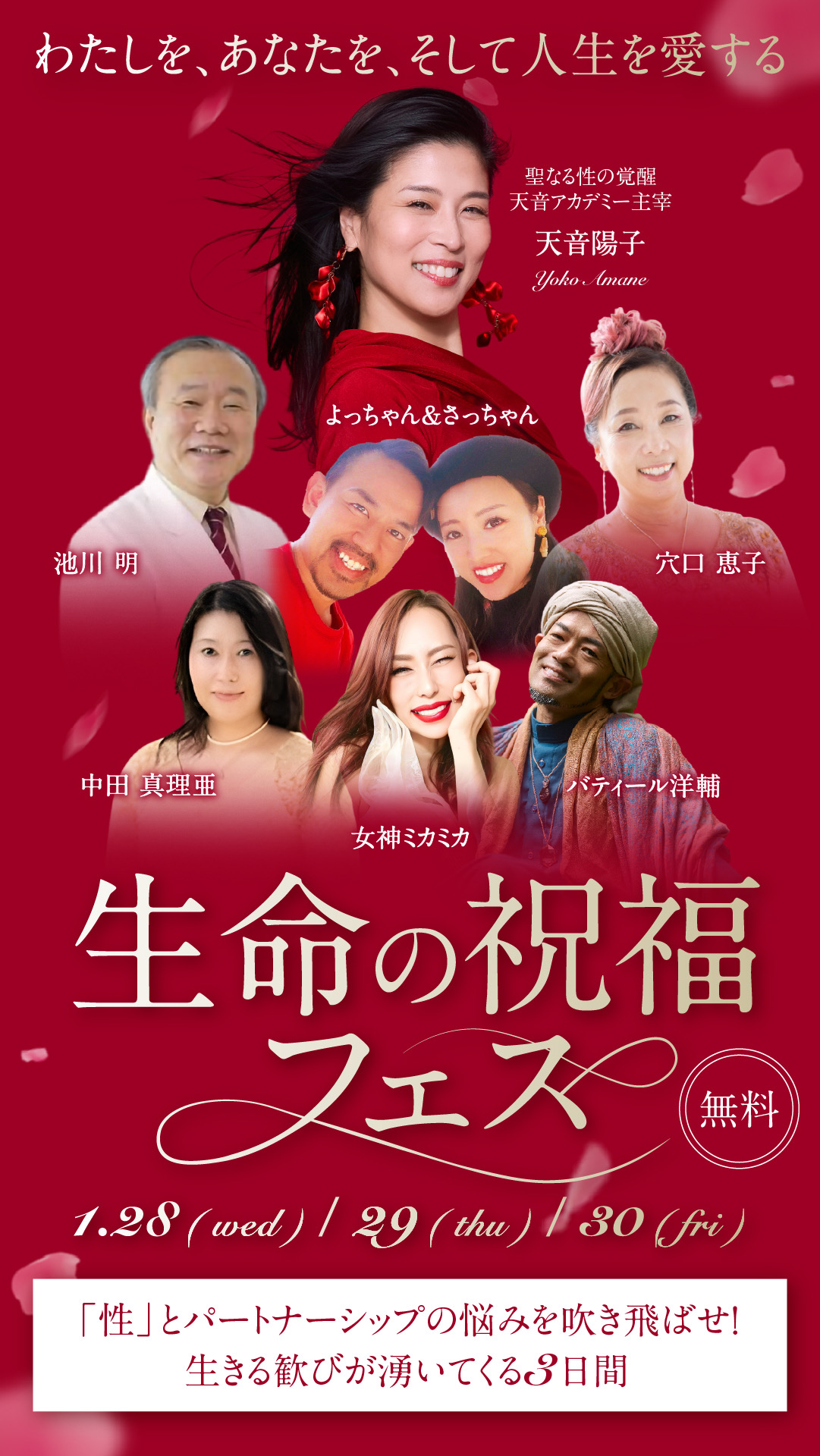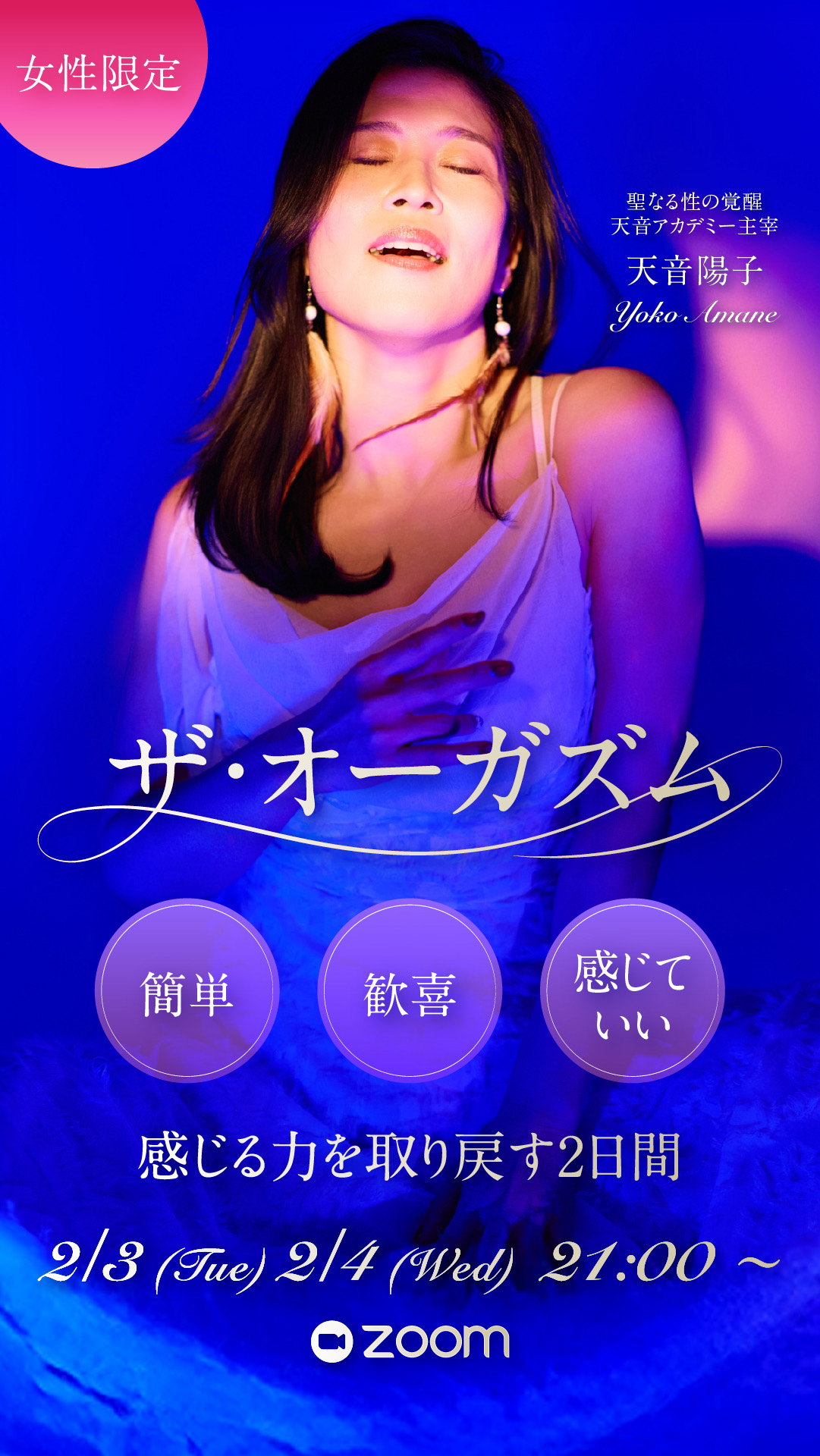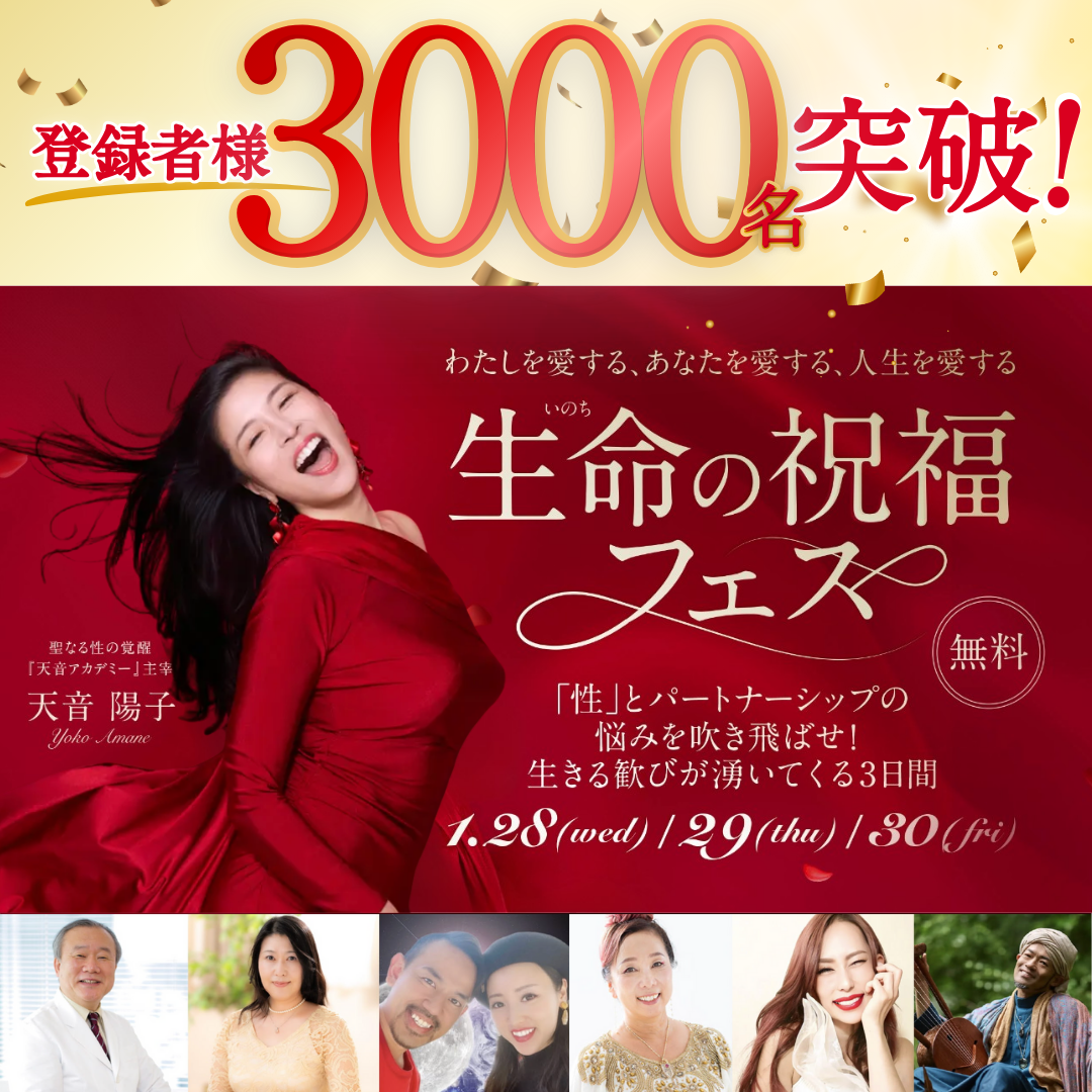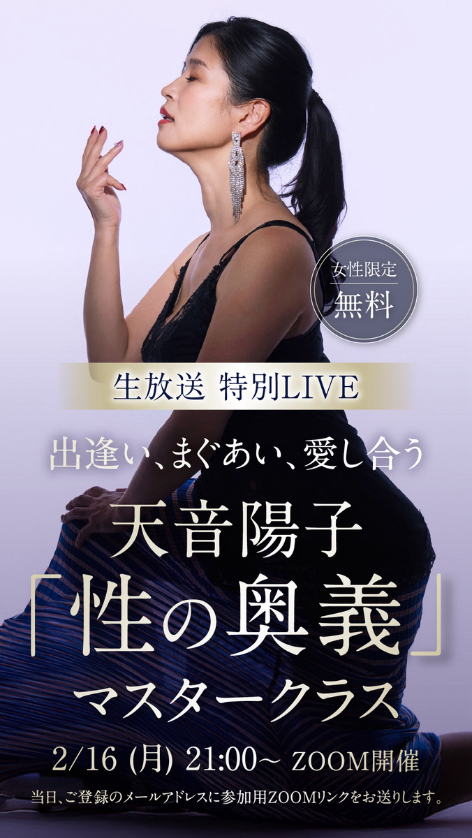 聖なる性の覚醒 sacred sexual awakening おかげさまで、天音アカデミー3期は定員を大幅に上回るご応募をいただき、大盛況のうちに募集を終了いたしました! 2026年盛り上がり加速中! 年明けからイベントが続き、エネルギーが一気に高まっています。 最新情報を見逃さないために 2026年は年明けからイベントが続き、エネルギーが一気に高まっています。次回募集や特別なご案内も、今後さらに加速していきます。大切なタイミングを逃さないよう、最新情報は公式LINEよりいち早くお届けしています。 天音陽子 公式LINEに登録 わたし達は誰でも 「性」を通して「生」を授かっています これまで、何万年と封印されてきた性の真実。 これを紐解くことで、 女性の秘めたる強烈なパワーが目覚めます! 女性の神秘を知り尽くしたわたしと共に 愛と喜びに満ちた聖なる扉を開きましょう! メッセージはこちら 2023年4月から連載させていただいているスピリチュアル雑誌《アネモネ》今月号は、天音陽子17ページ大特集!! ・セルフプレジャーは覚醒になぜ必要?・セイクリッド・セルフプレジャーのやり方・愛と祈りの「セルフプレジャー合宿」・聖なるセックスに適した体位・女性が主導するセックスの神聖な秘密・男性はどう変容するのか?・魂のパートナーのリアル体験告白まで!…等 anemone(アネモネ)2025年11月号 新着情報 すべての答えは「性」でしたアメブロ「すべての答えは「性」でした」 NEW! アメブロ「何が起きるかわからないけど、惹かれてしまった…」 「セルフLOVE&プレジャー講座2期生」合宿終了! 女神のセックス実践法「LOVEコミュニケーション講座」1期生濃厚合宿開催! 「シャスタシェア会」&「セルフLOVE&プレジャー講座2期生お茶会」大盛況のうちに終了! "聖なる性”の本質に迫る映像がついに公開!! ※下記の講座は「セルフLOVE&プレジャー講座」受講生へご案内しています。 性の悩みを抱えている女性… 0 % 聖なる扉を開くステップ 01 自己受容 ・ 自分を知る ・ どんな自分も受け入れる ・ 癖やパターンを知る ・ 好きなことを思い出す ・ 直感を無視しない 02 自己愛を深める ・ 身体や女性器の愛撫法を知る・ 不必要なエゴを手放す・ 細胞ひとつひとつに意識を向ける・ クリトリスの価値と存在意義を知る・ 自分を癒し高める方法を知る 03 本来の自分を生きる ・ 女神軸を確立する・ 周りの意見に惑わされない ・ 自己信頼を打ち立てる ・ 生き方に絶対的自信を持つ ・ 自分ならではの世界を創る 04 愛と喜びの パートナーシップ構築 ・ 男性と信頼関係を育む方法を知る・ あなたが望むセックスを知る ・ 女性主導のセックスに切り替える・ 男性にセックスをレクチャーする・ 慈愛に満ちたエネルギー循環法を知る 受講生の声 実際に体験した方の声を集めました 「汚らわしい」と思っていた私が「潤う」ように(M.A様) 性に奔放な女性を見るたびに「汚らしい」と思い、そんな自分も嫌いでした。膣の疾患をきっかけに潤いを失い不安を抱えていましたが、講座でのセルフプレジャーを通して感度と潤いが戻り、「性は愛を受け取る喜ばしいもの」へと意識が変わりました。 女性が満ちると、世界は幸せになる(N.S様) 陽子さんの講座は最高でした。インナーチャイルドが癒され、女性であることを心から楽しめるように。恥ずかしいと思っていたセルフプレジャーも「それでいい」と思え、今はそのままで愛されると感じています。 性の悩みを解決しに来た私が、人生が変わった(S.N様) パートナーシップの悩みと性の相性の苦しさから講座に入りました。最初は自分のためだけでしたが、安心できる場と仲間に出会い、変化を分かち合う喜びを実感。浄化が進み関係も改善し、今は心から幸せを感じています。 外見が激変しました!(K.T様) 顔つきが変わったと驚かれ、自分でも女性であることを楽しめるようになりました。性へのブロックが外れ、神聖で幸せなものと感じられるように。セルフプレジャーを通して心身が磨かれ、初めて心から打ち解けられる仲間にも出会えました。 自己肯定できるようになり、人生が好転!(M.T様) 講座に入ってから自分を許せるようになり、自然と笑顔が増えました。怒りや悲しみも受け入れられるように。性は根源で歓びそのものだと認識が変わり、自分を大切に思え、「すべてこれで良い」と確かな自己肯定感を持てるようになりました。 セルフプレジャーが大好きに(J.S様) 以前は満たされなさを埋めるためのセルフプレジャーで、虚しさや罪悪感が残っていました。けれど講座を通して自分を愛でる行為だと知り、心から満たされるように。外ではなく内側に意識が向き、自分を「かわいい」「大好き」と思えるようになりました。 その他の声はこちら 性を探究していくと、スピリチュアルの目覚めが起きる女性が多くいらっしゃいます。 スピリチュアル 月刊誌「anemone(アネモネ)」 2022年8月号にて16ページにも渡る大特集が組まれ、未だ反響を呼んでいます! 体験記はこちら 2023年4月号